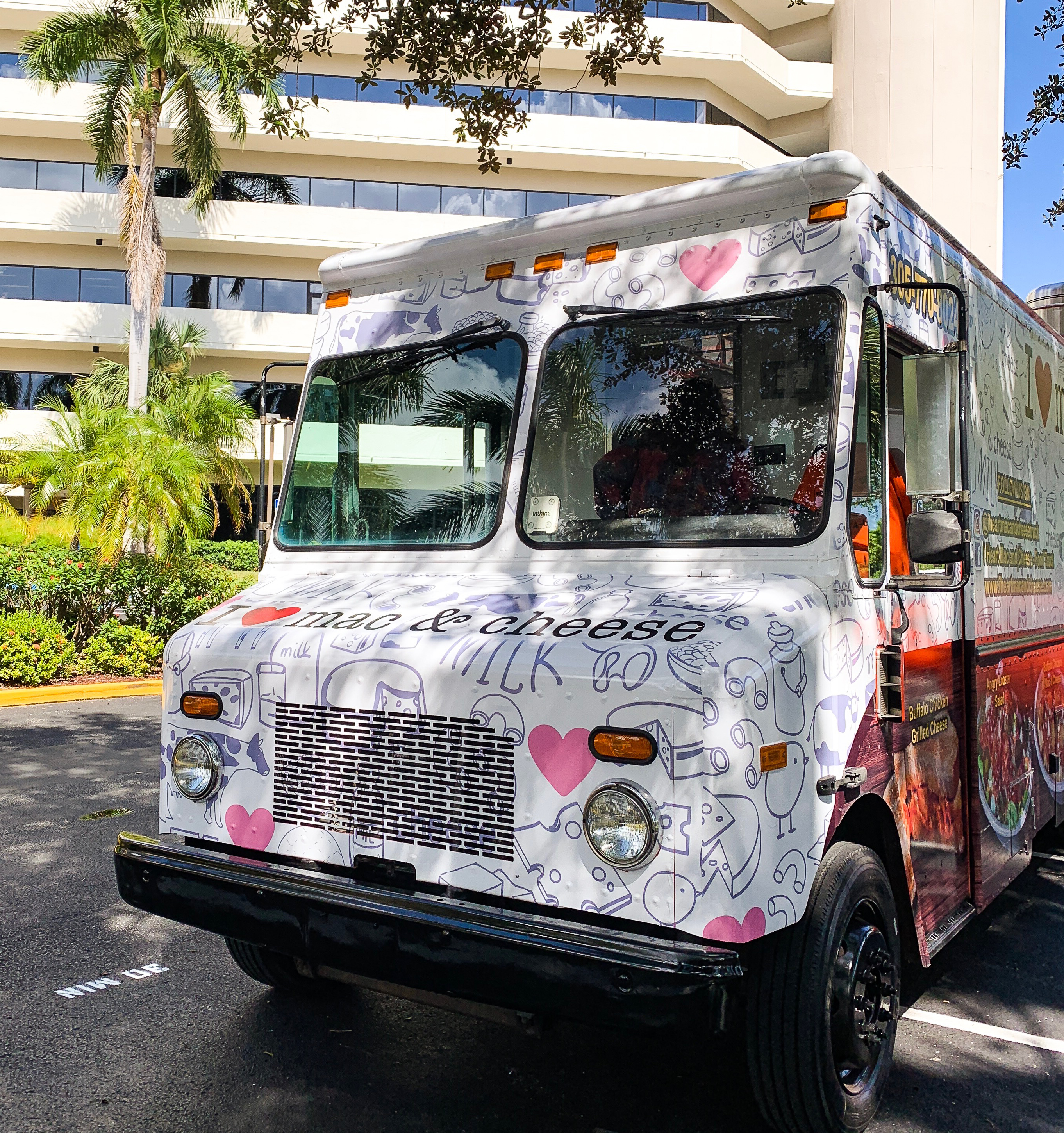 The truck's graphics, created by It's A Wrap of Miami, are based on the restaurant chain's imagery, and include large, realistic-looking illustrations of sandwiches and bowls of mac and cheese, salads and other dishes.