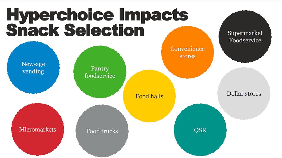 Foodservice operators cannot afford to surrender consumer preferences to other food channels, given what Henkes called the "hyper-choice" foodservice environment. Today's consumers are sourcing snacks from food trucks, vending machines, micro markets, convenience stores, QSRs, food halls, pantry service, dollar stores, supermarket foodservice, e-commerce, delivery services and subscription services.