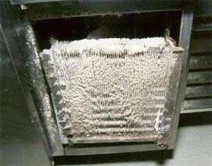 A dirty condenser coil shown at right is one of the biggest problems when it comes to any refrigerator, freezer or ice machine equipment. The result is your compressor works harder and longer than it's designed to, using more energy and shortening the projected life span of your investment.